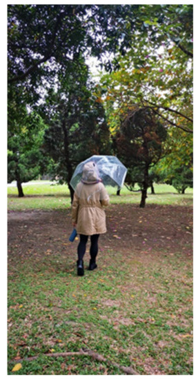 For the exposure, we arranged for four weekly 45 min visits to observe the impact of exposure to the same greenspace over a series of sessions. Some degree of flexibility was allowed for the participants to schedule the weekly sessions, that is, at most two days earlier or later than the original schedule, to accommodate their routine. As a result, the sessions were spaced out over an interval of five to nine days. For the experience, walking, sitting alone, or doing both were allowed, while it was recommended not to sleep, conversate, use a cell phone, perform physical exercise, or eat. To reduce interference by insects, outdoor group participants were advised to wear pants and long sleeves. A raincoat, transparent umbrella, and mosquito repellent were provided so participants could appreciate the environment in any conditions. Two sessions were rescheduled, one due to heavy rain and one due to chilly weather.