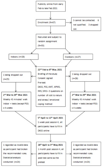 We used an online messaging platform to remind the participants a day before each session or test. One member of the research team was present in the park or the forestry building for observation of any abnormalities or non-compliance with the recommendations of the program. They observed one participant depart from the park and two participants use their phones. These three cases were not included in the final evaluation. The study was approved by Ethical Review of National Taiwan University (Case no.: 202008HS011).