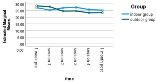 For the rumination subscale of RRS, there was a significant effect of time, as well as an interaction effect of time and group. For the indoor group, the pairwise comparison did not indicate a significant reduction in rumination across the different time points, whereas for the outdoor group, a significant reduction in rumination was observed when comparing the post-test (M = 23.45, SE = 1.67) to one week pre-test (M = 28.54, SE = 1.52, t(47) = −3.38, p < 0.01) and the first session (M = 27.88, SE = 1.53, t(47) = −2.89, p < 0.01). See Figure 4 for comparison of the two groups across the different time points.