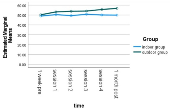 For CNS, there was a significant main effect of time as well as interaction effect of time and group. In the pairwise comparison of groups, the CNS of the outdoor group was significantly higher than the CNS of the indoor group for session four (indoor group mean = 50.08, SE = 1.79, outdoor group mean = 55.63, SE = 1.91, t(23) = 2.19, p < 0.05) and one month post-session-four (indoor group mean = 49.92, SE = 1.71, outdoor group mean = 56.79, SE = 2.32, t(23) = −2.38, p < 0.05). Examining the simple effect of time, the indoor group had no significant difference across different times; however, the outdoor group’s CNS scores for session two (M = 53.79, SE = 1.73, t(23) = 3.32, p < 01), session three (M = 54.04, SE = 2.12, t(23) = 2.68, p < 0.05), session four (M = 55.63, SE = 1.91, t(23) = 3.45, p < 0.01), and one month post (M = 56.79, SE = 2.32, t(23) = 3.78, p < 0.01) were each significantly higher than the pre-test score (M = 50.29, SE = 1.88). See Figure 5 for comparisons of the two groups across the different time points.