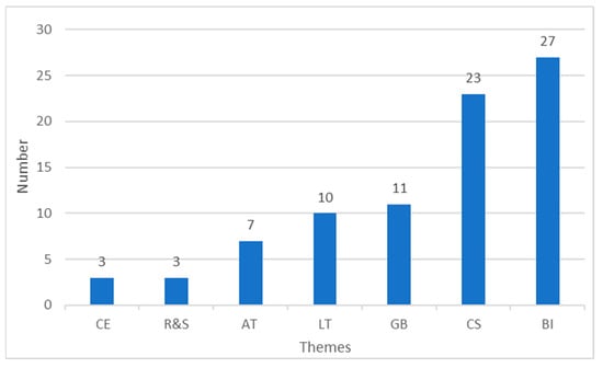 We used a broad definition of consumer behavior to identify themes of concern for researchers. Seven themes, namely customer experience (CE), recommendation and sharing (R&S), attitude (AT), general behavior (GB), loyalty (LT), customer satisfaction (CS), and behavioral intention (BI), were directly identified from the articles reviewed according to the focus topic or endogenous variables of the study (see Table A1 in Appendix A). It should be explained that behavioral intention refers to (re)use intention, (re)purchase intention, or other similar concepts, and that general behavior includes channel choice, actual use/purchase, and other items that are difficult to classify. Figure 3 indicates that behavioral intention was the theme that concerned most researchers, with 27 published articles discussing it, 15 of which highlighted the continuance intention (e.g., reuse or repurchase intention), followed by consumer satisfaction with 23 articles. Some of the articles reviewed involved and highlighted several themes and vice versa (similarly hereafter).