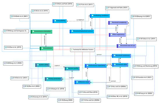 O2O commerce is the innovation of technology and business; therefore, technology acceptance and use theories have been widely used to explain consumers’ O2O behavior, which is in line with the e-commerce literature []. Perceived usefulness and ease of use derived from the TAM proposed by Davis [] and Davis et al. [] were two of the most popular constructs used to predict consumer behavior in the O2O literature. Technical attributes, especially usefulness, emphasize the extrinsic (utilitarian) motivation of consumers’ information technology use, which refers to the performance of a particular activity to achieve some objective distinct from the activity itself []. For example, consumers use O2O food delivery services instead of cooking by themselves to seek convenience [], another widely discussed determinant of consumers’ O2O behavior. The compatibility adapted from the diffusion of innovations theory developed by Rogers [] is another factor that determines consumers’ technology use behavior, whose similar constructs are facilitating conditions and perceived behavior control [,]. Some researchers also discussed the technical attributes of O2O commerce from the perspective of system quality, such as system safety [,] and privacy protection []. These technical or utilitarian factors were mentioned in the reviewed articles and constructed into a theme, as shown in Figure 5.