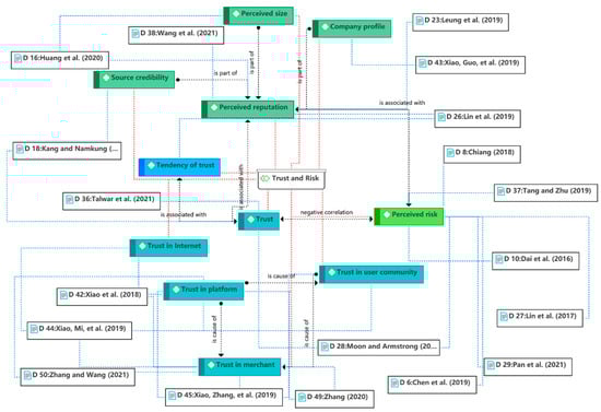 Because of the implicit uncertainty of the e-commerce environment, trust and perceived risk have been widely discussed. Trust and perceived risk are usually negatively correlated and directly or indirectly influence consumers’ behavioral intention in e-commerce [,]. Most studies in the O2O context have obtained similar results, and the literature evidence is shown in Figure 7. However, O2O commerce involves multiple players, to whom consumers are more closely connected. Therefore, some studies have discussed different types of trust, such as trust in the online platform, trust in the user community, and trust in the focal offline merchant [,]. O2O commerce is riskier than other business models for consumers because they cannot easily return or change their mind if they are not satisfied with the product or service, which results in more caution in making purchases [,]. In addition, reputation or other related factors play a similar role to trust and perceived risk, and can sometimes indirectly influence consumer behavior as antecedents of trust or perceived risk []. Figure 7 represents the construction of this theme.