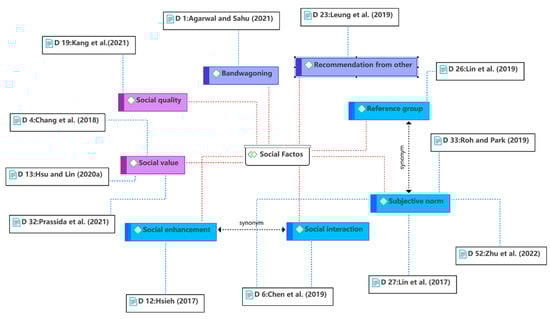 Social factors are another theme that emerged from the thematic review, as shown in Figure 9. The subjective norm derived from the theory of reasoned action (TRA) introduced by Fishbein and Ajzen [] is the most commonly used construct related to social factors in the literature. A similar construct is the reference group []. The social value refers to the utility derived from the O2O service in enhancing consumers’ social self-concept [,,]. Social enhancement and social interaction emphasize that interaction with others can enhance social approval and acceptance [,]. Social factors have been among the crucial factors considered concerning information technology consumers [,], which is also true in O2O commerce. In addition, Yang et al. [] reported that interaction between restaurant staff and customers still plays a significant role in O2O commerce. The social interaction in O2O commerce is more than in traditional e-commerce, and includes online and offline interactions.