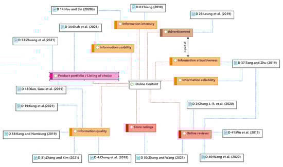 Similar to traditional e-commerce, the offline stores participating in O2O commerce upload information to O2O platforms, where consumers can also write online reviews (including fake reviews). Specifically, store locations, product or service details, operating time, discounts, store ratings, customer reviews, etc., constitute the online content of O2O commerce []. Marketers and researchers widely regard online content as essential in consumers’ decision-making. For instance, online information quality is one of the most commonly discussed factors, and has been shown to influence O2O consumer loyalty through satisfaction []. In addition, the perceived effectiveness of online reviews and store ratings on the O2O platform positively affect consumers’ trust in offline stores, thus affecting consumers’ purchase intention []. Many similar codes from the reviewed articles constructed this theme, as shown in Figure 10.