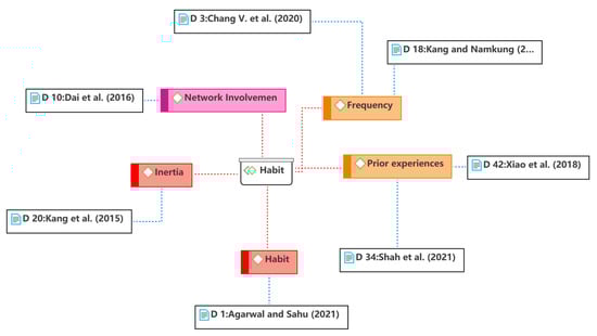 In the extension of the unified theory of acceptance and use of technology (UTAUT2), Venkatesh et al. [] introduced habit to predict consumers’ technology use behavior. Agarwal and Sahu [] have verified the effect of habit on the reuse intention of consumers in the context of O2O food delivery. Similarly, inertia influences consumer loyalty to the platform through switching costs []. Network involvement, which refers to the length of time customers spend accessing the Internet and their familiarity with it, directly influences consumers’ channel choice behavior in O2O commerce []. In addition, previous experiences or frequency of use affect consumer behavior in different forms (e.g., moderator). Figure 11 shows the composition of the theme.