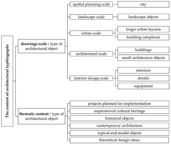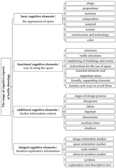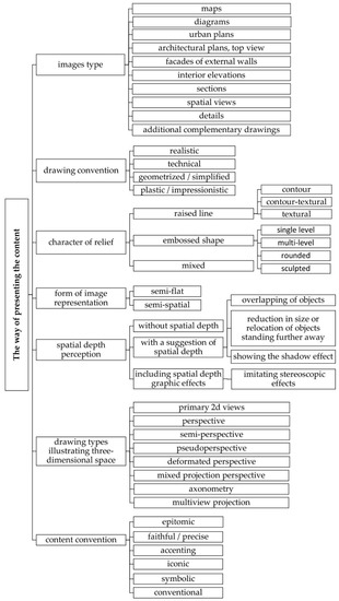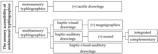 The need to develop a systematics of typhlographics was noticed by M. Jakubowski (a Polish typhlologist and publisher of numerous typhlographic studies), who in 2009 defined the concept of typhlographics as a graphical representation of reality using the scale, proportion, and generalization accessible by touch and sight to blind people and people with limited visual perception. He divided the drawings according to several criteria (such as a method of production, durability, reliability, repeatability, material, usefulness, correctness, place of production, type of recipient, cost of publishing, and amount of printing) [9] (pp. 36–40). This division is practical and organizes the issues selected by the author with respect to the creation, sharing, and use of typhlographs. In his research, the topic of typhlographics related to architecture appears many times, although the aforementioned systematics does not discuss them as a whole, nor as a separate type of drawings. The systematics presented by Jakubowski is multi-criterial (13 criteria), but not very extensive or detailed and focuses on the production process. Moreover, some of the criteria adopted by the author go beyond the objective description of the features of typhlographs and constitute an evaluation attempt. This goes beyond the intentions of this stage of research presented in this publication, which is aimed at logical ordering rather than valorization.