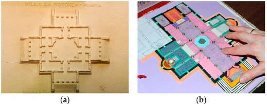 At the same time, the issues of typhlographics have not been properly placed in the theory of architecture. This subject appears sporadically in publications in the field of universal design [10,11,12,13]. The issues of showing three-dimensional space on flat drawings, which are somehow the basis of an architectural drawing, appear in a few studies presenting analyses of spatial sketches made by blind people [14,15,16,17,18]. Most of the scientific publications dealing with the topic of typhlographics relating to architecture, painting, and graphics focus on the analysis of specific methods of the interpretation and production of tactile drawings [19,20]. Selected aspects concerning strictly architectural tactile drawings can be found in A. Kłopotowska’s publications on the so-called Brailleons (a special form of thermoformed typhlographs) used in the architectural education of blind students [21] (pp. 229–233), in a publication on the presentation of architectural details in typhlographs [22] (pp. 269–273), and in excerpts from the book on experiencing space and art under conditions of visual dysfunction [23].