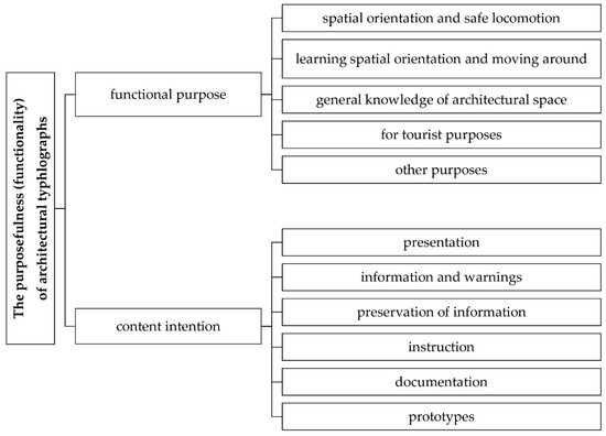 The authors’ research focused on the aspect of the usefulness (possibility of practical use) of architectural typhlographs for various tasks related to the functioning of blind people in physical and social spaces. The research area was narrowed down to the currently used functional areas of typhlographics. The potential fields of possible application, for which the authors have not found adequate and realized examples so far, have not been included in this study. The research team also analyzed the diverse nature of the drawings, considering the aspect of their intentionality as a tool for appropriately transferring defined content. In other words, the practical significance a given type of drawing has for its recipient was investigated.