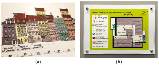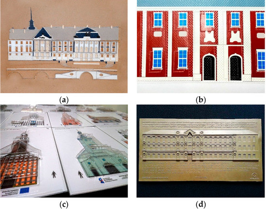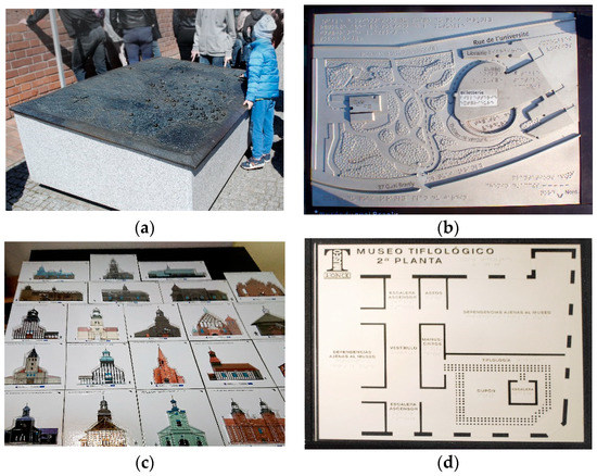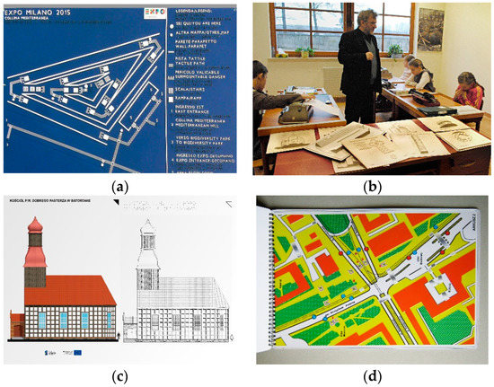 Typhlographics intended for various purposes: (a) spatial orientation; (b) supporting teaching materials; (c) materials for the development of architectural knowledge; (d) supporting tourism; Photo by: (a,b,d) Kłopotowski, M.; (c) Jakubowski, M.; Figures edited by Magdziak, M.