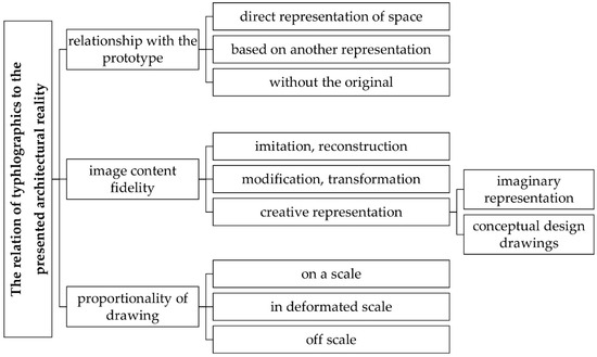 Following the principles of logical division, the authors tried to obtain the minimum possible number of division criteria, enabling the examination of the entire collection of architectural typhlographs (that is, considering each individual architectural typhlography, without leaving any of them outside the study). The selected criteria correspond to groups and subgroups of the features that meet the principles of equality and inferiority, applied in a logical division. The presented typology shows the dependence of the distinguished features (which affect the quality and correctness of the information transfer) on the assigned classification criterion.