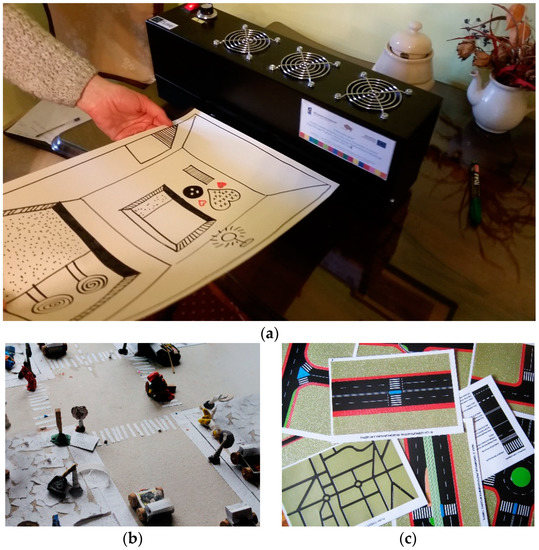 Figure 3. Sensory accessibility of typhlographics. (a) tactile drawing for the blind; (b) universal haptic-visual drawing. Photo by: (a,b) Kłopotowski, M.; Figures edited by Magdziak, M. - Haptic-auditory—raised-line drawings in which the visual elements are not significantly important, and the content is additionally supported by specially designed audio messages.