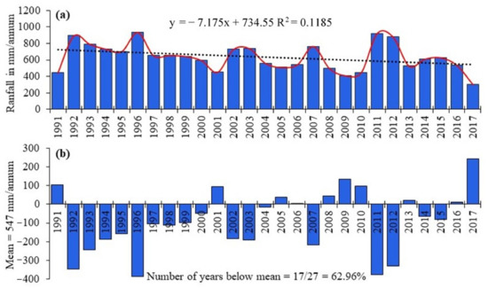 The long-term annual rainfall figures (1991–2017) were used to detect the long-term rainfall trend and AAR totals (Table 2) used to determine the influence of rainfall on the spatial distributions of different cover types that were mapped based on SPOT images that were acquired during the same year periods. This adjustment was reasoned to be necessary because it allowed different cover types to be related to the rainfall which influenced their spatial distributions, i.e., the rainfall that was received after July 1991 for the earliest image of this year could not be used to assess the influence of rainfall on the distributions of cover types that were mapped from the SPOT image of 26/07/1991.