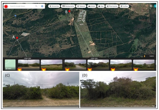 denotes Geo-located roadside photographs. (A,B)—Selected features in the image targeted for confident identification. (C)—Roadside view of point (A) in satellite image, Nov 2009. 33.924861S; 25.075820E. (D)—Roadside view of point (B) in image, Nov 2009. 33,921407S; 25.077065E. Link to source: [66].