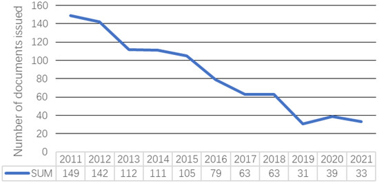 According to the above search conditions, a total of 927 documents were obtained through the analysis of NoteExpress software. Figure 2 shows the change trend of industry–university research cooperation policy research documents from 2011 to 2021. As can be seen from Figure 2, the literature on the policy research of production university research cooperation generally shows a linear downward trend. The literature decline in the past decade can be divided into two stages according to the speed of decline. First, from 2011 to 2018, the number of core papers decreased sharply in a stage of rapid decline. At this moment in time, according to China’s innovation system of combining industry, university, and research, it had been more than ten years, and the research on industry–university research cooperation gradually fell into a trough. Second, from 2019 to 2021, the number of core papers published in this stage stopped declining and remained relatively stable. The annual number of papers published fluctuated around 35. Combined with China’s successful entry into the ranks of innovative countries in 2020, it shows that domestic industry–university research cooperation is in a saturated state. However, considering the important value of future scientific and technological innovation, the research on industry–university research cooperation policies will gradually recover in the future.