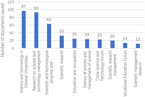 This paper selected the top ten journals with the highest number of papers on related topics from 2011 to 2021 (see Figure 3). According to the distribution of source journals in the literature every year, it can be seen that the largest number of papers can be found in “science and technology in colleges and universities in China”, with a number of 149; the second is “research on science and technology management”, with a number of 93. Among them, 90% of the journals belong to the social sciences, which shows that the humanities and social sciences in domestic academic circles pay more attention to the policy research of industry–university research cooperation.