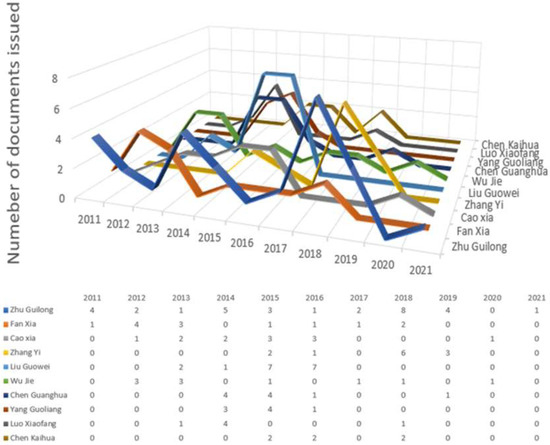 From the relevant data collected and extracted from the top 10 authors, Figure 4 clearly shows the publishing frequency of each author from 2011 to 2021. It is found that Zhu Guilong is the most active in terms of publishing volume, with an output almost every year, followed by Fan Xia, Cao Xia, and Zhang Yi. Zhu Guilong has the longest research time and Yang Guoliang has the shortest research time.