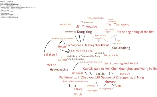 In order to further understand author cooperation, we ran the CiteSpace software and set the node type as the author to obtain the author’s collinear network knowledge map with the number of nodes, n = 358, the number of connections, e = 159, and a density of 0.0025 (see Figure 4 and Figure 5). As can be seen from the figure, the scholar with the largest number of nodes is Zhu Guilong, followed by Fan Xia, Zhang Yi, Chen Kaihua, Liu Guowei, Cao Xia, and Chen Guanghua. Due to the mutual exchange and cooperation of various scholars, several sub-author network structures are formed in the atlas, notably a network structure led by Zhu Guilong, Fan Xia, and Liu Guowei. The figure shows that several high-yield authors have low cooperation, which is mainly reflected in the academic exchanges and contact between Zhu Guilong, Zhang Yi, and Chen Kaihua, and less cooperation is seen with other scholars with large amount of papers (such as Liu Guowei, Chen Guanghua, etc.). There are many scholars in separate nodes, such as Wu Jie, Huang Jinsong, and Yuan Yijun. On the surface, it appears that Chinese scholars do not have a strong sense of communication and cooperation in the research of industry–university research cooperation policy, and the academic exchange and cooperation of scholars needs to be strengthened.