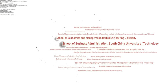 In order to further analyze the cooperation of institutions, the node type is set as institutions, and a co-occurrence knowledge map of institutions with 305 nodes, 0 connections, and 0 density is obtained (see Figure 6). From the generated map, it can be found that the school of Business Administration of South China University of Technology and the School of Economics and Management of Harbin Engineering University have larger nodes; the larger the nodes are, the more numerous they are. This shows that the researchers of the two institutions have published more documents and have a strong academic research ability in China. From the large number of nodes, and with the number of connections in the figure being 0, it can be seen that the connection between various institutions is quite loose, representing almost no connection, and reflecting the lack of cooperation consciousness between each other.