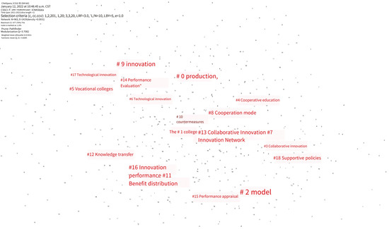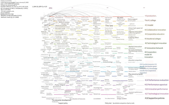 Using CiteSpace software to extract the keywords of literature data, we set the node type as the keyword, and set the three groups of C, CC, and CCV to have a threshold of 1, 1, and 20; 1, 1, and 20; and 3, 3, and 20, respectively. Other parameter values are set by default. Based on the keyword knowledge network map, the LLR algorithm is selected to obtain the keyword clustering network map as shown in Figure 7, in which the number of nodes is 963, the number of connections is 1419, and the network density is 0.0031. The figure shows 18 clusters of the phrases “industry university research”, “university”, “mode”, “collaborative innovation”, “cooperative education”, “higher vocational colleges”, “technological innovation”, “innovation network”, “cooperation mode”, “innovation”, “countermeasures”, “benefit distribution”, “knowledge transfer”, “cooperative innovation”, “performance evaluation”, “performance evaluation”, “innovation performance”, “scientific and technological innovation”, and “supporting policies”. This reflects the research hotspots in the field of the policy of domestic university research cooperation.