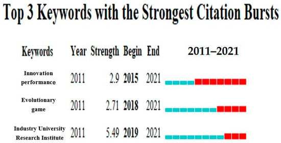 By analyzing the keywords in each cluster, it is found that the research contents of each cluster intersect with each other. Therefore, it can be seen that the domestic research on the policy of industry–university research cooperation can be summarized into three thematic areas: “industry–university research cooperation”, “innovation”, and “universities”. Three important related clusters of “industry university research”, “universities”, and “innovation” are taken as an example (Figure 8). In the literature, the industry university research cluster first appeared in Tian Huajie’s [1] Effect and Problem Thinking of Industry–University Research Cooperation Mode in 2011. Since 2011, the number of results in this cluster has increased, and the number of studies containing the keyword “industry university research” has increased rapidly. Moreover, over time, the attention paid to this cluster has been maintained at a high level. The keyword emergence diagram (Figure 9) also shows that the keyword “industry university research” achieved important results from 2019 to 2021, consistent with the recovery trend of the number of documents issued, as mentioned above. For example, Chen Yufen [2] used the social network analysis method to quantitatively analyze the characteristics of an industry–university research cooperative innovation network and its impact on innovation performance from two aspects: different stages and different industries. Guided by the vision of science and technology development in 2035, Ren Xingxin [3] discussed a feasible path to realize the effective combination of industry, university, and research by 2035, by dissecting Bi Yusui, Professor of Shandong University of Technology, and his team’s research and development of “chlorine free fluoropolyurethane new chemical foaming agent”. In the literature, a cluster of the keyword “innovation” first appeared in Jiang Zhengguo’s [4] Research on the Innovation of Teaching Operation Mechanism under the Background of Industry University Research Cooperative Education in Newly Built Local Undergraduate Colleges in 2011. In the same year, the clustering results began to increase and the research intensity also gradually increased. Results in the literature on the clustering of the keyword “universities” first appeared in Huang Yanfei’s An Analysis of the Ways to Form the Advantages of Independent Innovation of University Official Industry Research University Cooperation—Taking the Universities in the Yangtze River Delta as an Example in 2011 [5]. The clustering results began to increase from 2011, but on the whole, the intensity of the three clusters decreased with the passage of time. At the same time, it can be seen from the emergence chart that the emerging keyword from 2015 to 2021 is “innovation performance”; from 2018 to 2021, the emergent keyword is “evolutionary game”; and from 2019 to 2021, the term “industry university research” emerged, and the emergence rate of these three terms has continued to this day, which shows that these three keywords represent the main development trend of domestic university research cooperation policy research.