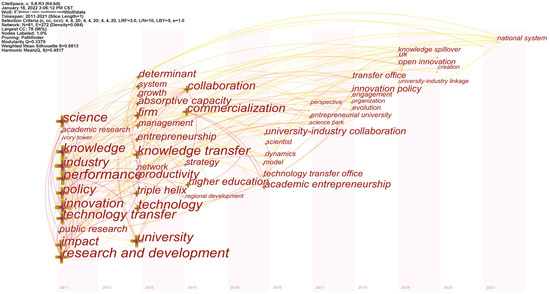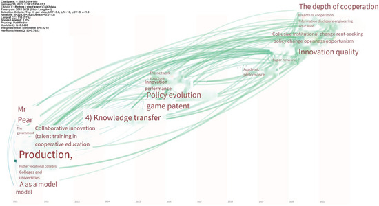 In addition, we used the CiteSpace software to extract the keywords from the literature and create the keyword time zone map, in order to reflect the research content of this topic changing with time, and then observed the research trend in a certain time period. We set the top n of the selection criteria to 10 and the thresholds of C, CC, and CCV to 3, 3, and 20; 3, 3, and 20; and 3, 3, and 20, respectively. We obtained a keyword time zone map of industry–university research cooperation policy research (Figure 10).