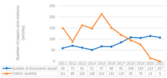 As can be seen from Figure 11, foreign research on the policy of industry–university research cooperation is relatively stable, and the number of documents issued generally shows a slow upward trend year by year, breaking through the annual number of 100 in 2018. Relatively speaking, the number of citations shows a very unstable trend. The number of citations shows three stages from 2011 to 2021: a stage of decline from 2011 to 2012, a recovery stage from 2013 to 2015, and a stage of continuous decline from 2016 to 2021. This indicates that foreign research on industry–university research cooperation policy has increased steadily on the whole, but research hotspots have been greatly updated and changed during this period, which has affected the stability of citation data. This shows that the research trend of industry–university research cooperation policy abroad is broader, and the research hotspot is more cutting-edge.