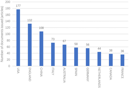 In terms of countries issuing documents for policy research on industry–university research cooperation, this paper screened the top ten countries (Figure 12). The United States was the first country to realize the combination of industry, university, and research. Its industrialization and modernization have attracted worldwide attention. In particular, the great achievements of the “Silicon Valley model” have attracted a wave of research cooperation among countries. The first countries to study the policy of industry–university research cooperation are also countries that have enjoyed the results of industry–university research cooperation in advance. Among the top ten countries, there are eight European and American countries, one Asian country, and one Oceanian country. It can be seen that European and American countries have certain leading advantages in this research topic. Secondly, it can be seen that the research on industry–university research cooperation policy is generally paid more attention all over the world, and the scope of research subjects is broad.