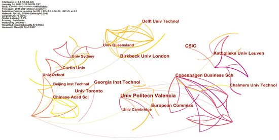 We ran the CiteSpace software, set the node type as the mechanism, and obtained the number of nodes, n = 310, the number of connections, e = 190, and a density of 0.004. Among them, the network modularization evaluation index, q = 0.8991, the author’s collinear network knowledge map (see Figure 13), and the Q value, which tended to be 1, indicating that the network clustering effect of the research content in the map is good. As can be seen from the figure, there are roughly six cooperative groups. Among them, the largest is the cooperation network centered on the Technical University of Valencia in Spain, which is also the most central point in the whole analysis. The second is the cooperation network centered on the Georgia Institute of Technology, Canadian Immigration Consultant Industry Association, London Berkeley University, European Commission, and Copenhagen Business School. The Georgia Institute of Technology has close cooperation with the Chinese Academy of Sciences and Beijing University of Technology. What is quite different from what was found in China is that most of the relevant research networks abroad have relatively close research cooperation. It can be seen that international cooperation is one of the important conditions for the progress of policy research on industry–university research cooperation. More schools and institutions will cooperate and exchange knowledge in the future.