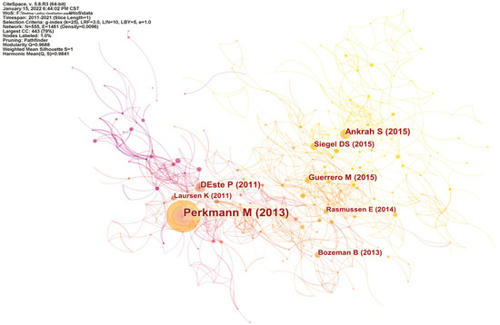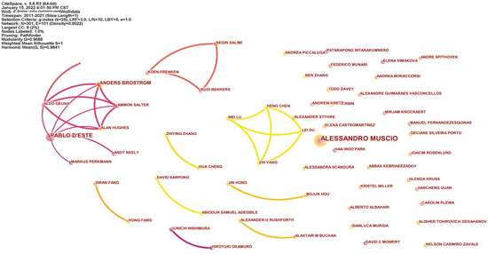 After importing the data into CiteSpace, the author was selected as the node type. According to statistics, the number of authors of foreign industry–university research cooperation policy research from 2011 to 2021 was 2618, with an average of 2.93 authors per article. Table 5 reflects the author statistics of the top 10 high-frequency citations generated after the operation of CiteSpace software. Among the six articles cited by Alessandro Musi [11], The Effects of University Rules on Spinoff Creation: The Case of Academy in Italy has been cited 53 times, which is a highly cited work in the literature and an important research achievement in this research field. At the same time, there are four Chinese scholars in this book. It can be seen that China’s research level and quality have been recognized by foreign academic circles.