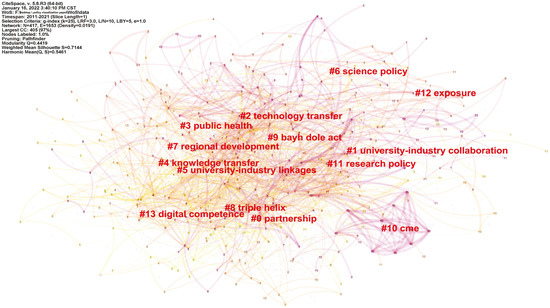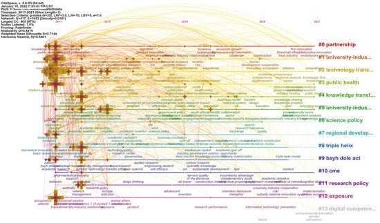 There were 5527 keywords in the retrieved literature, with an average of 5.85 keywords per article. The top 20 high-frequency keywords were selected according to the word frequency list produced using CiteSpace (see Table 7). The word with the highest frequency was industry, followed by innovation, performance, and university, which represent the core of the research. In addition, the focus of foreign research on industry–university research cooperation policy is relatively uniform, being embodied in keywords such as knowledge, research and development, policy, technology transfer, science, and impact.