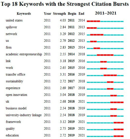 After forming the timeline (see Figure 17), the first seven clusters are partnership, university industry collaboration, technology transfer, public health, knowledge transfer, university industry linkages, and science policy. The occurrence time of keywords under the first cluster is discussed in R&D Productivity and the Organization of Cluster Policy: an Empirical Evaluation of the Industrial Cluster Project in Japan, published by Nishimura in April 2011, since, in the same year, the clustering results began to increase. Combined with the list of keywords (see Figure 18), the university industry linkage increased rapidly from 2018–2019. Similarly, the amount of attention paid toward the business model suddenly increased from 2018–2019, which attracted further attention. Over time, the research of this clustering has been maintained at a high level. There are also two special clusters. One is the research policy, which began clustering in 2012. The first is Limingliang’s The Role of Chinese Universities in Enterprise University Research Collaboration, which has attracted continuous attention. Another cluster is regional development, which first appeared in 2011. The first document is Villasana’s Founding University Industry Interactions under a Triple Helix Model: The Case of Nuevo Leon, Mexico. Since 2011, the number of clustering results has increased. Relatively speaking, sustainability began to emerge in 2017 and ended in 2018. In the same year, clustering became colder, attention decreased, and clustering stopped in 2019.