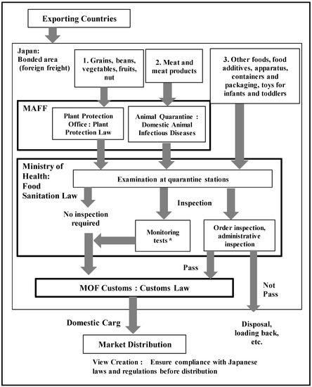 - Ministry of Health, Labor and Welfare. Import Procedure Based on the Food Sanitation Law. Available online: https://www.mhlw.go.jp/stf/seisakunitsuite/bunya/kenkou_iryou/shokuhin/yunyu_kanshi/kanshi/index.html (accessed on 31 May 2021).