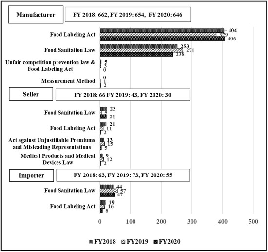 Food product recalls that occurred in Japan from 2018 to 2020 were classified as those foods produced in Japan (hereafter referred to as domestic foods) and those imported (imported foods). Domestic foods were sub-classified based on the manufacturer and seller while imported foods were sub-classified based on the importer. Within the three responsibility categories (i.e., manufacturer, seller, and importer), each recall was classified based on the following laws and regulations that were violated to analyze trends in reasons for recall: Food Labeling Act, Food Sanitation Law, Unfair Competition Prevention Law, Measurement Method, Act Against Unjustifiable Premiums and Misleading Representation, and Medical Products and Medical Devices Law. The laws and regulations violated by each recall were determined based on the information in the reasons for recall. For manufacturer-attributed recalls, the reasons for recall were variables in the analyses, whereas for importer-attributed recalls, the variables were quarantine inspection violations. Subsequently, the recalls in each responsibility category were classified into 29 reasons for recall. The items of the reasons were created by the author based on approximately 2300 recall instances. Classification of food product recalls based on laws and regulations violated and reasons for recall, as carried out in the present study, has never been previously performed in Japan.