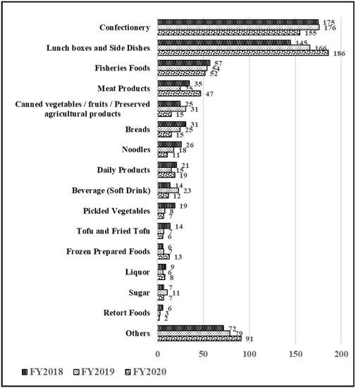 The data used in the analysis were provided by the Japan Food Industry Association [12] and the Consumer Affairs Agency [13], and those were secondary. The names of the businesses that produced the recalled food products, their lot numbers, and the reasons for the recall were included in the data. In other words, the sources of information are Japanese national regulatory bodies. The reports are prepared for consumers and customers, and mainly list the product name, associated company, range of products recalled, lot number, reason for recall, and potential health hazards. The documentation was not uniform, as the information was presented in multiple formats. The data sources did not distinguish between ordered and voluntary recalls; hence, the analysis was performed without this distinction. The reports in different formats were investigated individually, and the data were manually classified into fiscal years based on the start date of the recall. The number of recall cases without duplication was 791 in 2018, 770 in 2019, and 731 in 2020. Voluntary recalls for reasons related to quality, rather than violations of laws and regulations, were excluded from the analysis.