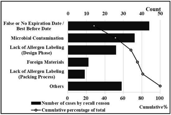 Figure 4 is a pareto chart in which recalls in the confectionery category are classified based on the reasons for recall. As the reasons for recalls in the top two categories showed the same trends from 2018 to 2020, only the data from 2020 were analyzed. The most common reason for confectionery recall was the “false indication of expiration or best-before date or no indication” in 44 of 155 cases (~28%). The second most common reason was “microbial contamination” with 36 cases, of which 25 (~70%) were caused by molds. The third most common reason was “the lack of allergen labeling (design)” with 26 cases, followed by “contamination” with 11 cases, of which approximately 50% were contaminated by dangerous foreign materials. Finally, “the lack of indication of allergen” (e.g., labeling error) related to the packing process was the fifth most common cause for recall, with nine cases. The top five reasons for recall accounted for approximately 81% of all 155 recall cases in the confectionery category. The trend for “confectionery” was consistent with the pareto principle, that is, the “80/20” pattern.