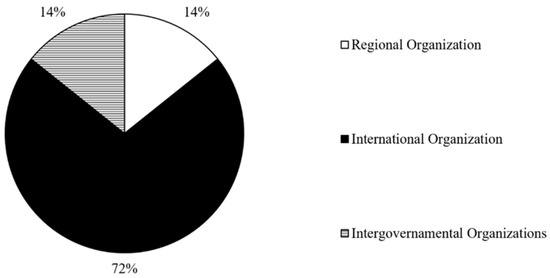 On the other hand, within the field of international organizations, research studies differ based on organizational scope. As shown in Figure 2, authors have studied intergovernmental, international, and regional organizations. Remarkably, Hansen, McLaughlin Mitchell, and Nemeth [79] studied both international and regional organizations using the same dataset.