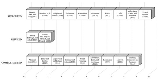 As observed in Figure 5, the main group of the articles (10 out of 21) supports rationalism with empirical evidence. Remarkably, three of them are authored by Koremenos. Initially, this research suggests that Koremenos, Lipson, and Snidal’s [2] statements are strongly supported by the empirical literature. The support of the second subgroup (11 out of 21) of studies is ambiguous, and the rational explanations of these studies are complemented by other potential variables. Noticeably, this trend supports the belief that institutionalism schools should meet halfway.