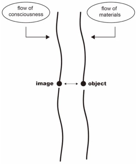 The Kavalan people of Taiwan have been weaving and crafting with banana fibres for more than a century []. The MDD step of understanding material characterisation stresses developing an understanding of raw-material collection, especially regarding the acquisition techniques used in traditional crafting and the historical and cultural knowledge of materials. Meanwhile, how these materials interact with users under various conditions (e.g., compression or varying temperatures), what issues arise related to these materials (from a human perspective), and how people respond to these materials [] are also significant. Moreover, by studying the continuous relationship between innovation and inheritance, anthropologists can examine the cultural information pertaining to the creation, use, or transformation of objects by humans within the context of material culture; this includes the conversion of raw materials into products, artefacts, and objects and its implications for the evolution of life [,]. Ingole’s proposal of different materials and material variability is illustrated in Figure 1. The connection between objects and human life can be envisioned as two lines flowing in parallel; specifically, one line represents the flow of consciousness in the form of life, sound, and sensations, whereas the other line represents the flow of materials that circulate, mix, and merge. Along the two vertical flow paths, two horizontally aligned nodes—image and object—are generated [].