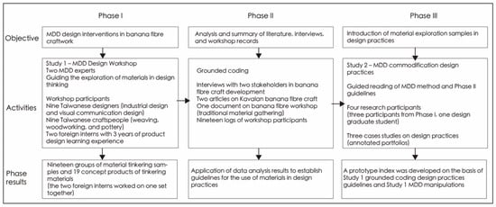 The present study was conducted in three phases (Figure 2). The first phase involved the holistic exploration and understanding of the material significance of traditional Kavalan banana-fibre crafts through an MDD design workshop. Semifinished products, which were produced through the innovative use of materials by designers and craftspeople, were used to restructure visible knowledge and construct a design foundation (Phase I). In the second phase, an in-depth content analysis was conducted in accordance with grounded theory [], whereby local banana-fibre craftspeople (i.e., stakeholders) were interviewed to obtain an understanding of the management and development of banana-fibre crafts and the current status of actual traditional materials and techniques, and the engagement of the study participants in the exploration, tinkering, and repeated deconstruction of banana fibres during workshops was recorded. The purpose was to determine the invisible power that drives material expressions and innovative designs during exploration of the material (Phase II). Lastly, to support the results from the analysis in Phase II and to establish MDD commodification design practices, Phase III was conducted by inviting two research students specialising in product design who were undergoing received professional design training (i.e., they have product development skills that have not yet been rigidified by industry experience) to interact with the three craftspeople who demonstrated high degrees of concrete realisation during the Phase I prototyping process. The main activities were as follows.