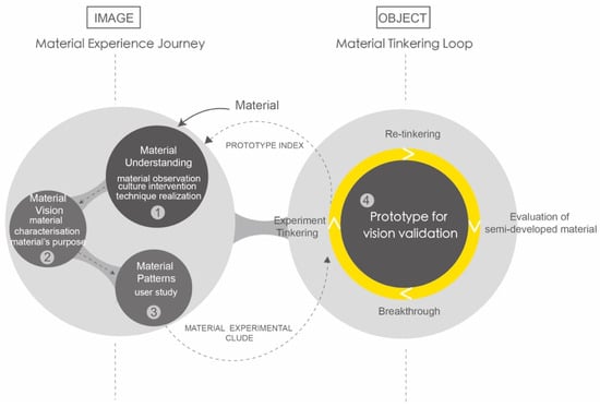 Karana et al. (2015) published “Material Driven Design (MDD): A Method to Design for Material Experiences” to establish a record of designers’ designs and experiences with materials at hand and understand how a material behaves under different circumstances or reacts to different techniques or manufacturing processes, the interpretation of materials, and design behaviours driven by materials, with the purpose of guiding the development of materials []. The MDD method emphasises the designer’s process, which moves from the tangible to the abstract and then back to the tangible, in addition to the journey of a material from the final design stage back to hands-on experimentations, material priming, and prototyping []. The method comprises the four following steps: (1) understanding the material (i.e., technical and experimental characterisation); (2) creating a visual experience of the materials; (3) manifesting material experience patterns; and (4) designing material/product concepts. The MDD method also emphasises how the potential properties of a material can guide specific forms of manipulation [], such as material tinkering, participants documenting the material-making process to build knowledge on material tinkering, and collaborations between material stakeholders [,,,,,]. By reviewing their understanding of the continuity among the design, timing of use, and structure of the materials, researchers can introduce new steps or a material taxonomy to analyse material growth environments, compositions, processing, and structures and thereby produce new findings related to the role of materials and the experiences of users. Consequently, the MDD method allows for the development of derivative forms, functions, and experiences of materials that are not yet fully developed []. Relevant examples include materials made from recycled waste (e.g., mussel shells) [], 3D textiles and printing [], organic biomass materials (fungus filament) [,], smart materials that require further development [], and the development of artificial textiles made from plant roots [].