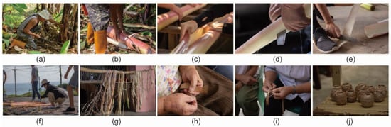 Material collection process. Top row: (a,b) chopping down a banana tree; (c) stripping sheaths; (d) cutting a sheath in half; (e) scraping the flesh. Bottom row: (f) exposure to the sun; (g) washing and dryING; (h,i) making thread; (j) straightening the threads into yarn. (Photographed by 1st author).