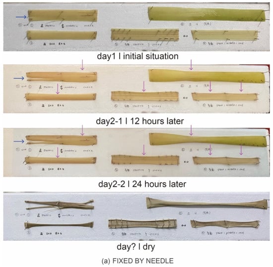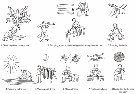 Three days before the workshop was conducted during Phase I, the 20 participants and the two MDD experts visited the source of the banana-fibre material that was examined in the present study (i.e., Kavalan Xinshe Village in Hualien, Taiwan) to conduct a field study on this material (Figure 4). During this activity, the participants were asked to collect banana fibres in person. In addition, village elders and tribespeople provided guidance on traditional craftmanship, and the participants gained a deeper understanding of the history and culture of the banana-fibre material through their dialogue with the MDD instructors []. Subsequently, the traditional process of banana-fibre-material making was illustrated, as shown in Figure 5, by organising the activity outcomes.