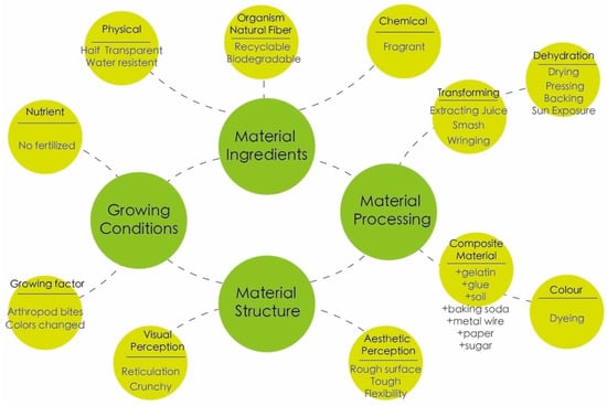 The processing and manufacturing (e.g., bending, forging, gluing, and cutting) of the material affects its performance in terms of its structure (including the microscopic molecular composition and the macroscopic visual structure) and properties (e.g., hardness and strength, which includes compressive strength and shear resistance). Accordingly, the concept of material connections classification in crafting is similar to that in materials-science technology and research. Therefore, after the participants understood the traditional manufacturing process of the material examined in the present study, they summarised its properties, preparation process, visual structure, and the growing environment by following the MDD method and preparing a material taxonomy prior to the material-tinkering activity (Figure 6); the material taxonomy served as a reference for clarifying the subsequent MDD-based material tinkering. The material taxonomy comprised four primary components, as follows: (1) material ingredients refer to the compositional quality of banana-fibre material (including its organic natural fibre, recyclability, degradability, natural smell, and biological water resistance); (2) growing conditions refer to the growth-related environmental factors to which bananas are exposed (e.g., cultivation near a harsh seashore environment, lack of fertilisation, and insect bites); (3) material structure refers to the dimensions of material composition (including two- and three-dimensional configurations and composition heterogeneity (density and stratification)); (4) material treatment refers to material processing (including post-processing steps such as dyeing, pressing, hot pressing, and drying). The four aforementioned aspects influence one another. For example, variations in dyeing can develop because of differences between growing environments. Therefore, controlling for variations relating to coefficients or correlational factors can be highly challenging.