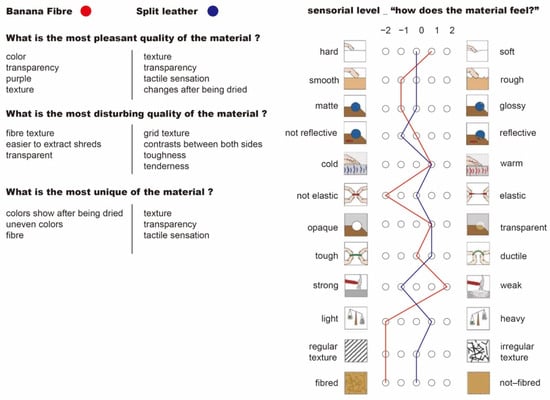 After the steps of material understanding and preliminary material-tinkering categorisation were completed, the MDD experts introduced tools for the experiential characterisation of materials; specifically, tools for material-driven material selection (MDMS) [] were used to collect quantitative data comprising four levels of experiential feedback, namely, sensorial, interpretive, affective, and performative feedback. Thus, the users conducted a material perception evaluation on the basis of relativity (e.g., qualities of smoothness and roughness) within the frame of five designated scales of values. For example, Figure 7 presents the MDD tool kit for the sensorial level in the experiential characterisation of the materials examined in the present study. The material perception evaluation was conducted through interviews with the participants to understand their perceptions and feelings regarding the banana-fibre material (including their visual, tactile, and emotional perception).