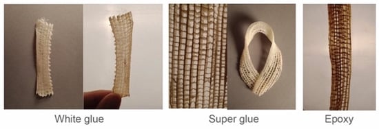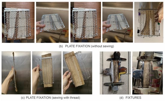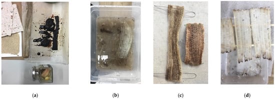 Action Step 4 of the MDD method is regarded as a recyclable loop. Specifically, the material tinkering performed in Action Step 1 served as the loop in the design prototyping practice and experimental flow in Action Step 4, and it gradually formed a systematic structure involving design thinking for design practice cases through continual experimentation, manufacturing, and modification processes involving the sample material. The role of participants in material tinkering is that of a chef; they have to evaluate the materials that are available and consider their options for cooking the “ingredients” that they have, which vary depending on their familiarity with the materials and tools or their individual specialty. Experimental material tinkering was the starting point for entering the loop. Due to the large sample size of the present study, only specific representative samples are presented. The experimental case samples are presented in Figure 8. CH, a participant who specialises in fibre crafts, experimented on basic food-processing techniques for treating composite materials, which included candying, salting, and caramelisation. Figure 8a shows the candied and heated caramelised samples. The material thinking of DD, a participant who was an industrial designer, accentuates the functional aspect through reinforcing of the fibre structure with metallic fibre (Figure 8b). CF, a participant who was a woodworker, experimented with pulp blending and the addition of natural resin glue by applying the concepts of material compounding, water absorption, and for maintenance of the material’s natural grid structure (Figure 8c,d). After presenting their sample materials through preliminary experimental tinkering, all the participants were guided on the operation of material re-tinkering by the experts.