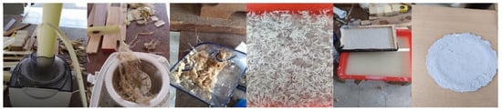 Material-tinkering process (left to right: wooden mould, fibre soaking, chopping of fibre, grinding of fibre, extracting of long fibre, and mixing and water-pressing of long and short fibres). (photographed by 1st author).