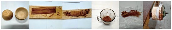 In Phase I, the designer Chung-Han Lu and the woodworker Jing-Teng Lin collaborated to implement the shredding-and-mixing design method for material tinkering (Figure 15 and Figure 16). The actual implementation of the design was conducted separately by each designer. First, Lu processed the shredded banana-fibre material into a quantified scale and form for material tinkering and revised the model prototype design to establish a more realistic scale for future mass production. Subsequently, Lin, who specialises in fine woodworking, applied a woodturning technique to create the wooden mould required for design development, thereby ensuring the completeness of the prototype design concept (Figure 17). The researcher held two discussions with the participant in each case. During this phase, pulp was not added to the banana-fibre material. Instead, the participants referenced the “tinkering” concept applied by designers and used short banana fibres to replace the function of pulp fibre. The recomposite material, which was created using shredded banana fibre, was used to tinker and replace waterproof sections. Therefore, a waterproof coating that consisted of beeswax and isinglass was applied to the surface of the material to achieve the set functions required in disposable utensils that use the new material.