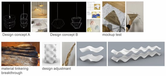 Notably, RtD has two main mechanisms. The first is the defence of research specificity [,,,]; as described by Frayling, RtD treats design as a unique form of thinking and a unique method for establishing knowledge that can further our understanding of non-design topics. The second is the foundation of design research based on existing academic research precedents or methods, particularly in the context of natural sciences, social sciences, and the arts [,,]. Gaver and Bowers proposed that the similarities and familial resemblances of artefacts manifested through design research can be summarised using annotated portfolios, which combine visual information with concise descriptions. The resultant intermediate knowledge enables designers to express the indexical connections of their design as research design and communication, providing them with an alternative means of interpreting and predicting the composition of a design in research outcomes [,]. In essence, annotated portfolios present specific design objects and provide corresponding textual descriptions; compared with the application of unsuitable scientific research methods, the intuitive explanation of evidence associated with annotated portfolios is a more appropriate method for verifying design in research []. Consequently, when we return to the material as a starting point in MDD to examine how the essence of materials and their samples inspire design concepts (for the purpose of highlighting the application value of crafting), we must exploit the objectives of RtD [] to systematically examine the concepts pertaining to material sampling, material tinkering, and prototyping, and gradually adjust the designs in our study. Furthermore, the annotated portfolios were empirical designs for validating MDD practices in design research [,]. Lastly, the experimental product designs were completed with the application of RtD concepts and subsequently used to establish a guiding method for designers [,].