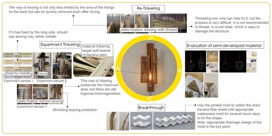 The observations and summary at this phase revealed that, because the material used in the present experiment was drawn from the banana stem (the form of which is a complete plant stem), the participants generally focused on deconstructing and recombining banana fibre using the following techniques: (1) adding—beeswax, gelatine, white glue, epoxy resin, pulp, clay, and metallic fibre were added to endow banana fibre with water resistance and to reinforce its structuredness; (2) drying—hot pressing, baking, or natural sun-drying were performed to reinforce the fibre structure and enhance its resilience; (3) smashing—aggressive and comprehensive damage was dealt to the banana-fibre material through the use of choppers or high-speed mixers, and the material is then blended with heterogenous materials for recombination and formation, thereby expanding the plastic-related applications of the product.